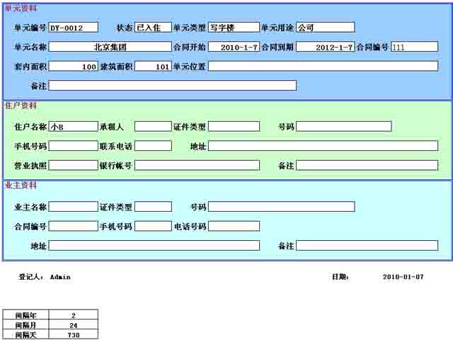 单元信息的设置是整个收费管理的关键点。在【单元信息】模板下设定了两个工作表,工作表一保存着单元的基本信息,像单元资料,住户资料和业主资料。其中,输入“合同开始”和“合同到期”日期后,excel公式自动计算出合同的年份长度,月份长度和日期长度。