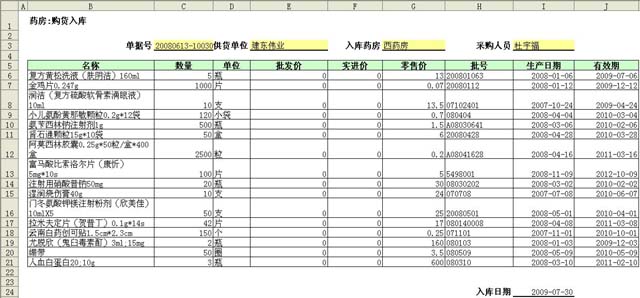 新建一张【药品:购货入库】,“名称”,“单位”,“零售价”是通过列表选择得出的。“数量”,“批发价”,“实进价”,“批号”,“生产日期”,“有效期”需要手工录入。入库单被保存后,该批号的库存会被补充到【药品字典】中的明细表部分。如下图所示。
