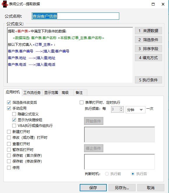 4.弹出“表间公式-提取数据”窗口,在公式名称处输入“查询客户信息”,应用方式选择“筛选条件改变后”,如下图。