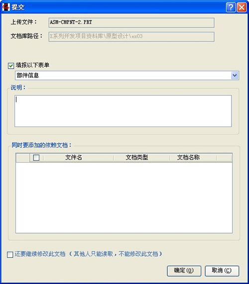 - 签出并打开文档库中的Pro/E文档,提交,在提交窗口上,勾选“填报以下表单”,选择“部件信息”。