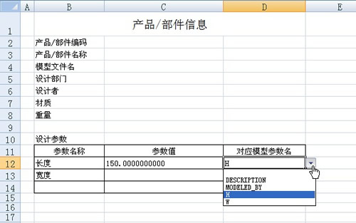 下面我们在如前图 所示的“部件信息”模板上定义一个CAD Reader,把一个Pro/E模型中定义的所有参数提取出来,在“设计参数”明细表的“对应模型参数名”那里构造下拉列表。