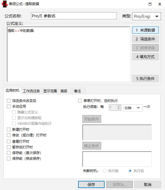 4.弹出“表间公式—提取数据”窗口,这个窗口和定义普通的提数公式的窗口几乎是一样的,只有一点小区别:在“公式名称”旁边多出来一个“类型”下拉列表,里面是Excel服务器2024 CAD版(CAD服务器2024)所支持的三种CAD软件的名称;我们这里要定义一个从Pro/E文档中提取数据的公式,所以类型选择“Pro/Engineer”;