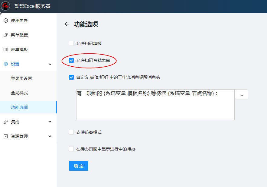 1.移动端设计页面中选中【设置】-【功能选项】,勾选“扫码查找表单”,【确定】。